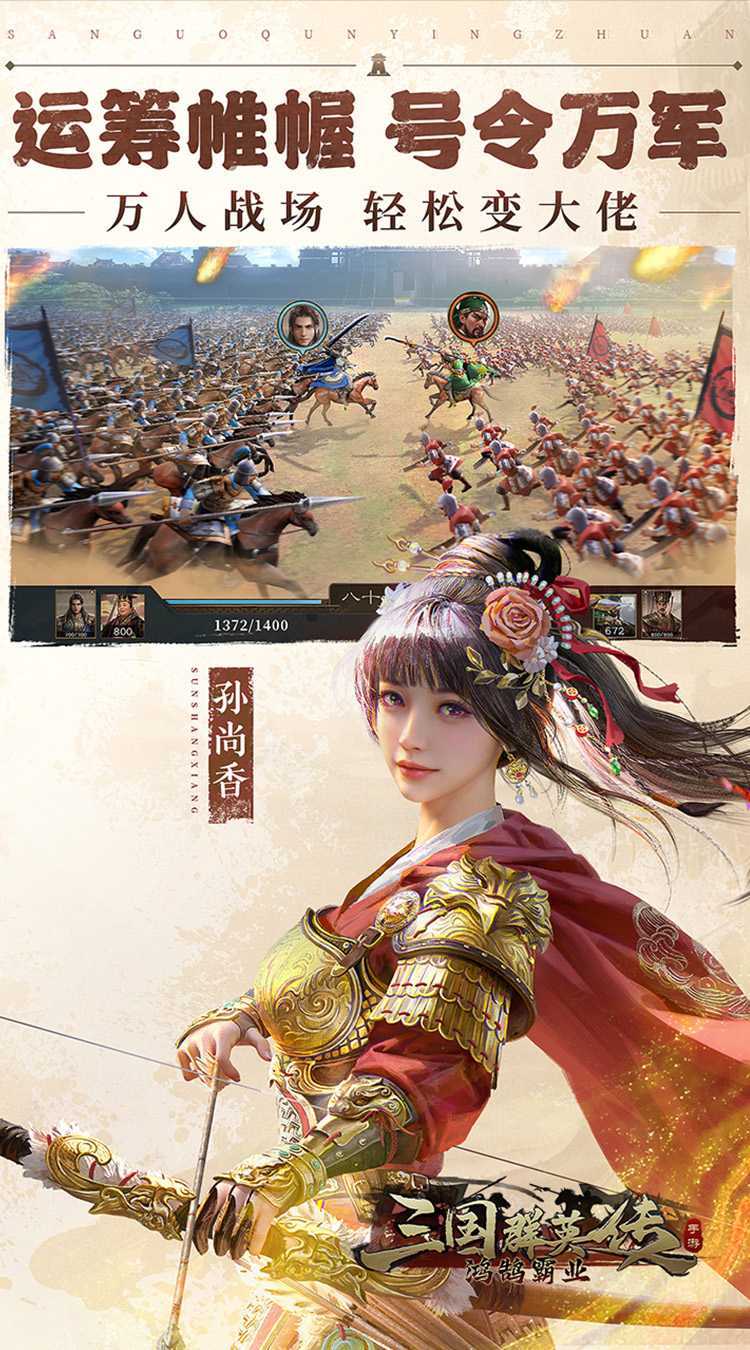 在《三国群英传:鸿鹄霸业》中,你将以一方诸侯身份重回三国,参与角逐天下,通过与其他玩家合纵联盟占领洛阳。开局通过超高的爆率抽取和劝降获得名将,轻松获取大量资源,号令万军战场厮杀;最后剑指洛阳,夺取天下!【爽抽橙将,玩转沙盘策略】卧龙凤雏,我全都要!三国名将任你抽,还可以运用不同的策略来劝降不同阵营的各路英雄,首周保底18橙将,五虎、桃园等经典阵容轻松配齐,平民也能轻松拥有T0队!【五谷丰登,轻松有资源】无损开荒,资源爆仓!资源是你征服天下的基石,车马未到,粮草先行,多种方式轻松获取足够的粮草来支撑你的雄心壮志!【多种兵种,轻松来进阶】兵种进阶,轻松制敌!玩家可通过兵种之间的克制以及特性的优劣,来做出多样的进阶选择,打造出历史上赫赫有名的三国特种兵,且看西凉铁骑逐鹿天下,虎豹骑大破关西!【万人战场,轻松变大佬】运筹帷幄,号令万军!让你体验高品质的真实三国战场,百万沙盘,万寸之间,奇诡谋士尽情施展,斩将夺旗,尽显英雄本色!