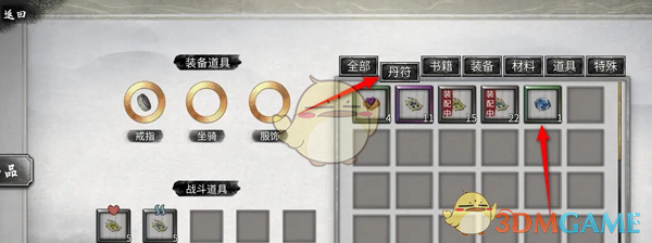 2、在物品页面,筛选丹符,找到五品雷灵果进行使用;