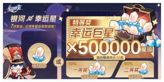 崩坏星穹铁道50万星琼抽奖选择,年终了,不止公司在发放奖金和福利留住老员工们,游戏也是,众多的奖励让我们一同感受那份欢乐的游戏,单人独揽50星琼,想想是多么幸运的事情呢,谁将会是你们区服的锦鲤之王呢。