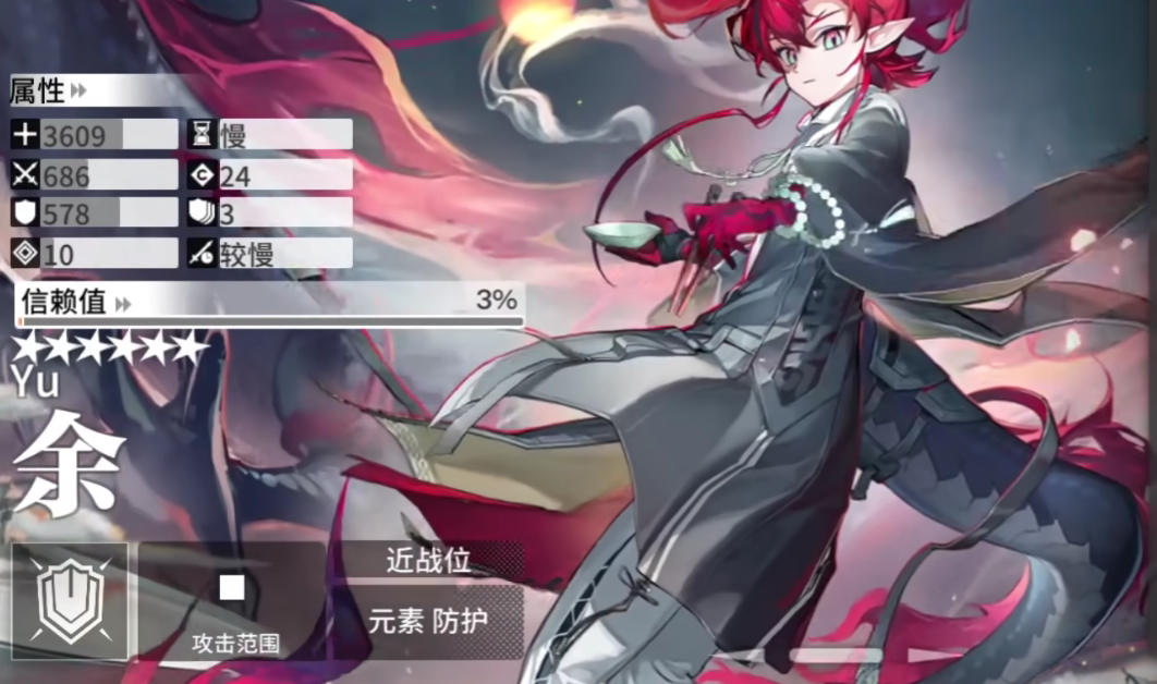 余在游戏当中的定位是一个六星干员,属于重装类职业,在游戏当中的职能是防守防护,一般会位于游戏的前锋位置。