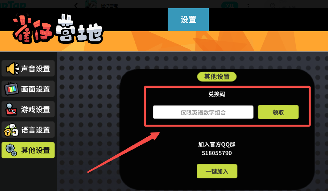 2、点击【其他设置】,可看到【兑换码】输入框,输入对应的礼包码即可兑换礼包奖励。