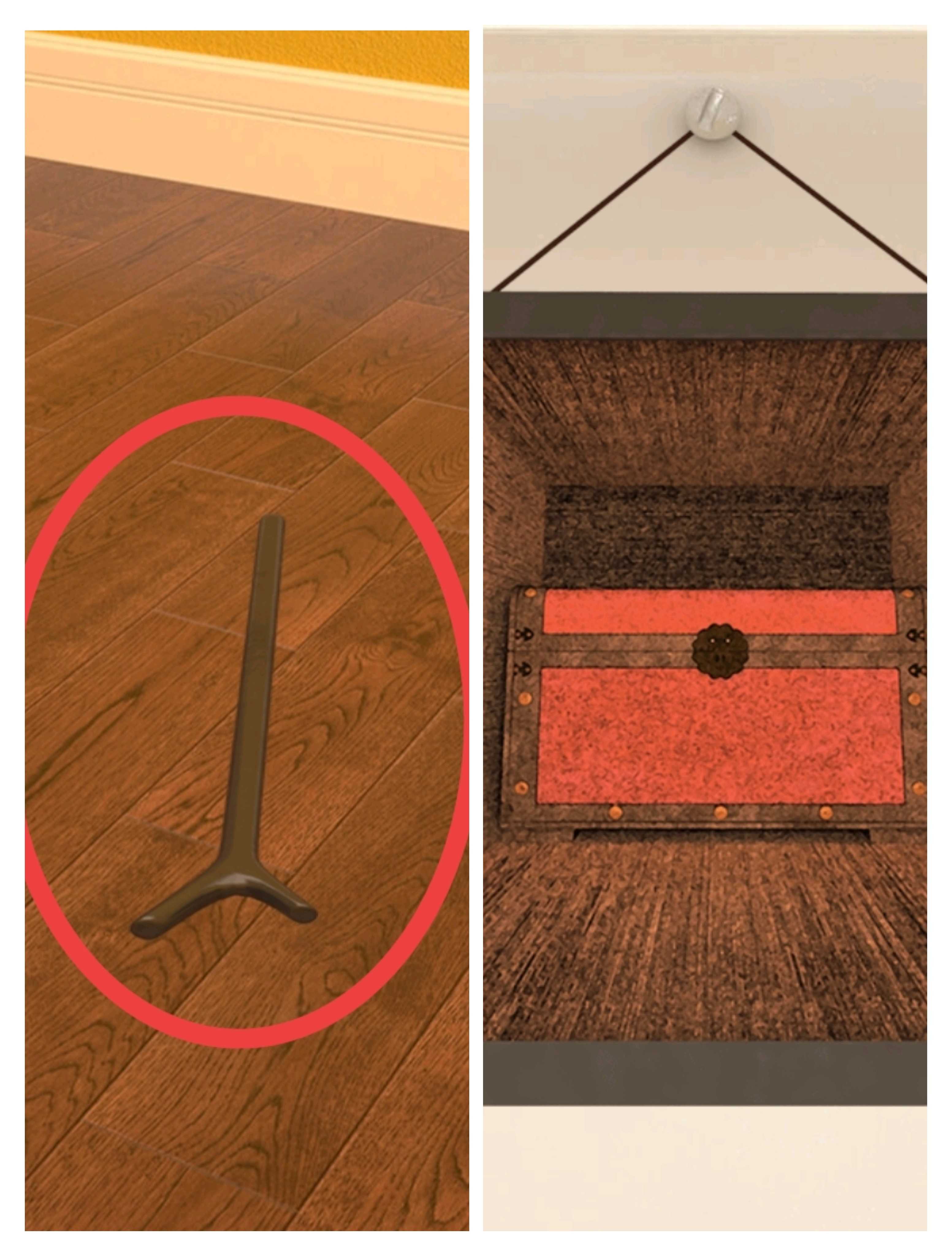 2.点击第三个场景左上的画,得到Y形木棍,回到第一个场景用Y形木棍取下最上面的画,得到手电筒