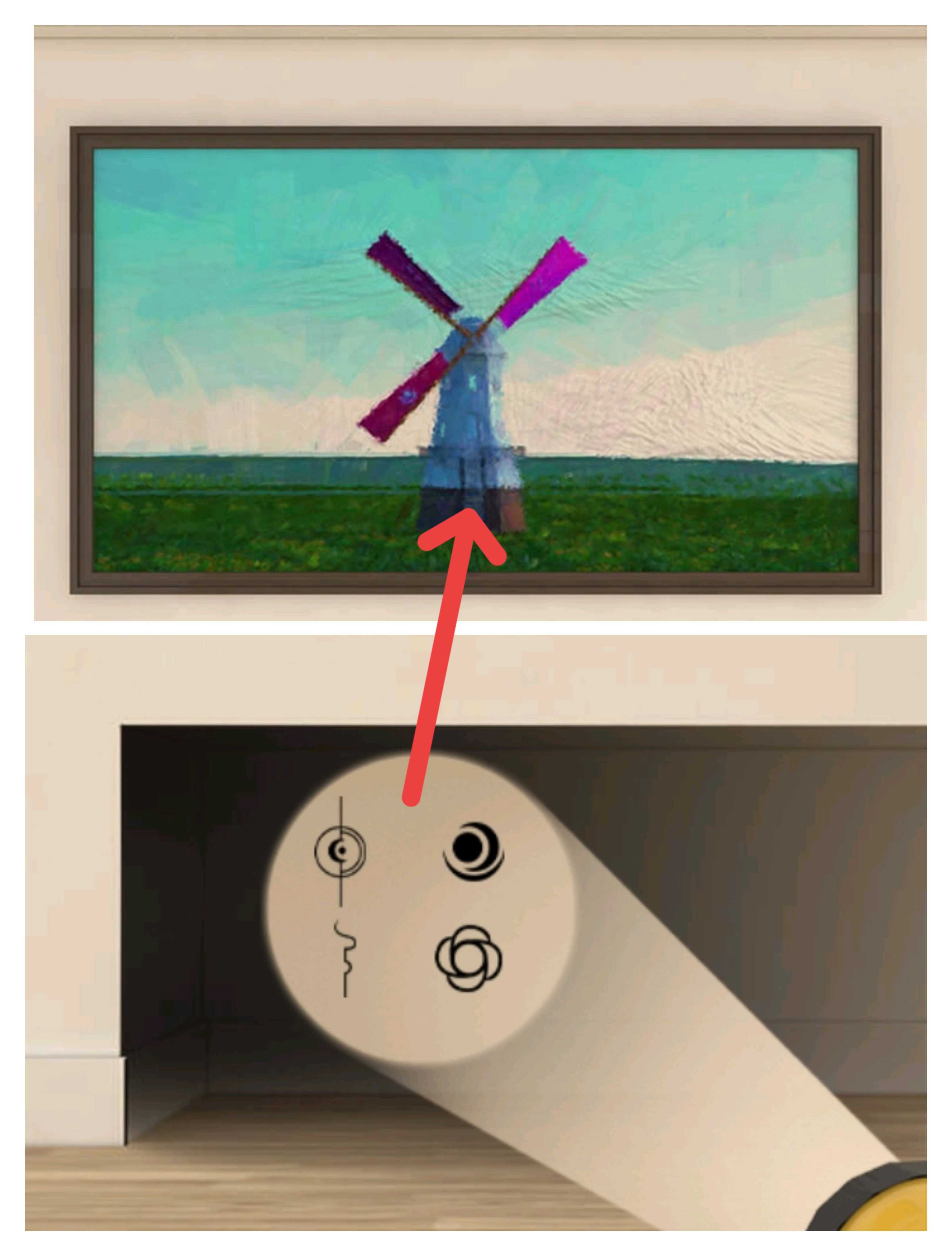 4.把国旗(第3步)交给第四个场景右下画中的士兵,可获得旗杆,在第三个场景的暗角处使用手电筒(第2步)得到图形密码,把旗杆插在第二个场景左上画中的风车上,按照获得的图形密码进行排序,得到扳手