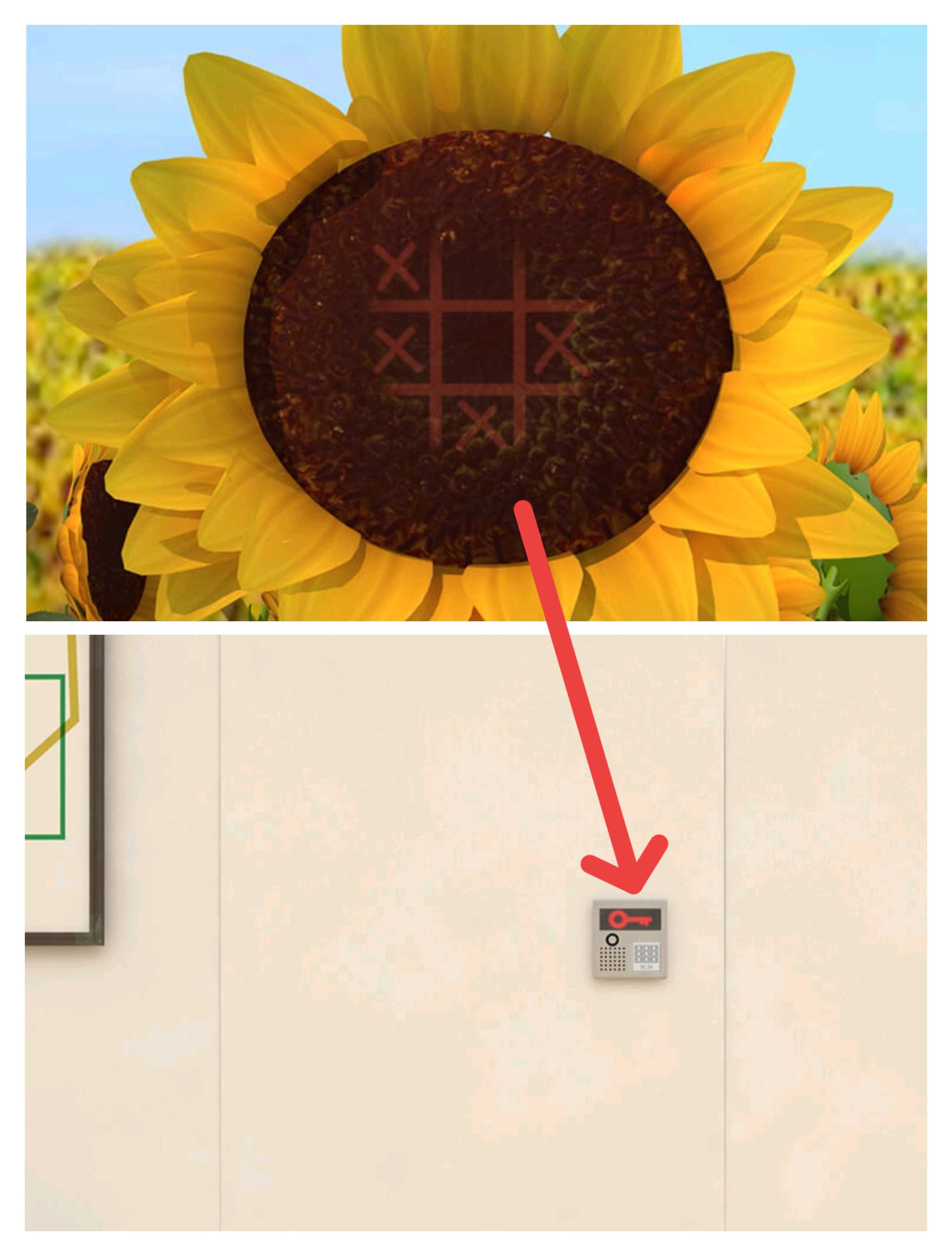 10.把苹果汁(第9步)交给榨汁机画旁边画中的酒保,得到小伞,再把小伞放入第四个场景的向日葵画中,点击最高的向日葵花盘得到第五个场景小门密码,打开密室