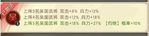 吴国的提高灼烧概率是按照人数来定的,人数越多加成的数值越高,最高的时候是可以提升到攻击提升18%,兵力提升27%以及灼烧概率提升10%的效果,太史慈其实在队伍当中负责的就是点火,也属于是核心角色,所以是必不可少的角色之一,而周泰的必杀列阵事很适合放在前牌的,有效果可以恢复兵力,防御也很适合放在这个队伍,而且周泰的技能还可以对敌人造成一定的伤害,并有几率使敌人陷入虚弱状态。