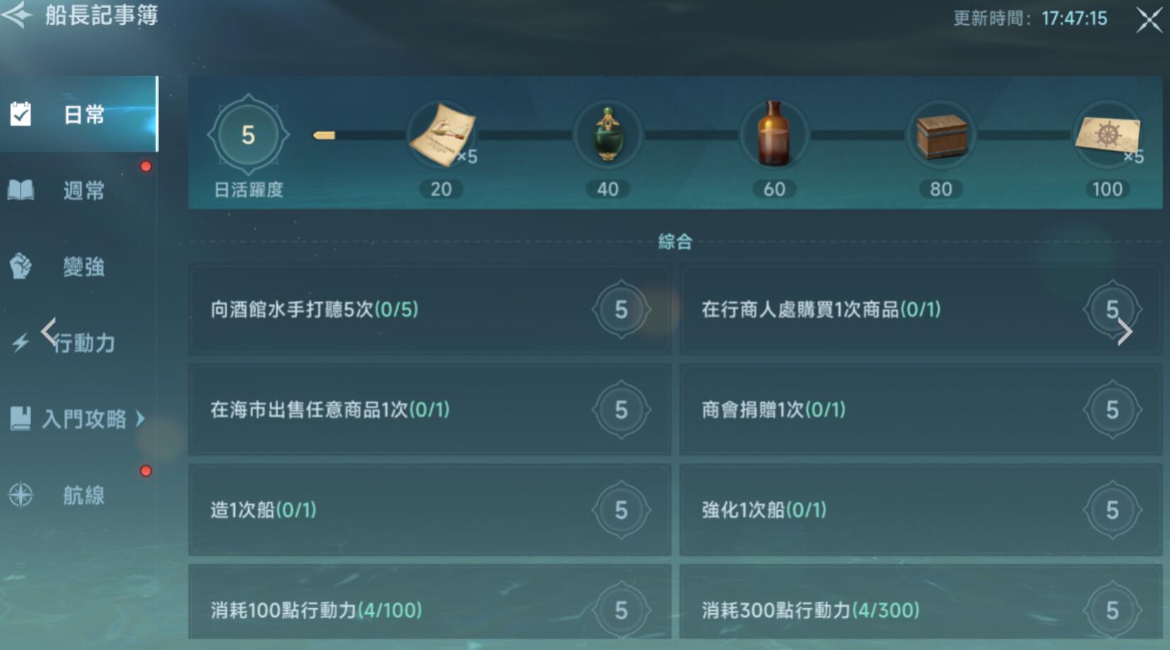游戏初期优先利用新手流行贸易机制,该玩法仅对综合等级≤50或商业等级≤25的玩家开放。选择港口间距近的贸易路线小编推荐里斯本-伦敦葡萄酒路线,利用低运输成本快速积累金币与采买书这也是提升商店进货上限的关键道具,每日必领国家奖励500金币(主界面点击国家进度条领取),长期积累可缓解资金压力。参与每日12:00与19:00的幽灵船活动,组队击败幽灵舰队后通过拍卖分红,单次收益可达数千至数万金币,有了金币就能帮助我们更快升级。