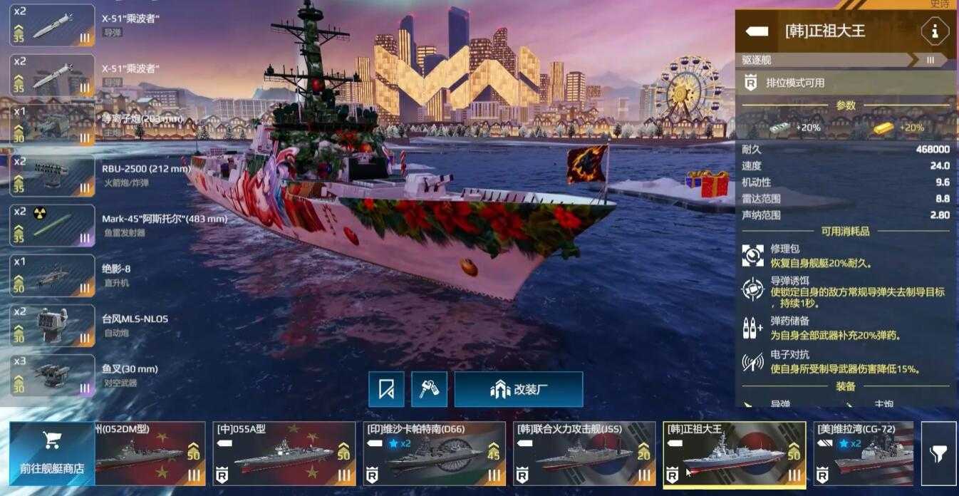正祖大王号的特点就是均衡的火力配置与防空反导能力,成为中远距离作战的强力全船只。尽管存在机动性与反潜短板,但通过大家不断积累经验玩法,仍能发挥推线压制与区域控制的核心作用。若追求稳定输出与团队玩法,还是非常值得大家投入资源开发一下的。