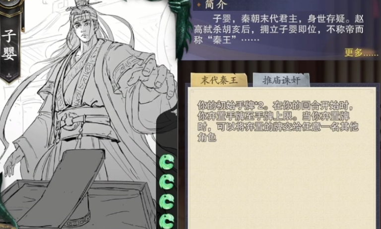 近期,游戏实装了两位新武将,其中4月10日更新的子婴,作为秦国阵营的精英卡牌,子婴拥有独特的技能组合,子婴作为末代秦王,其基础手牌数为4,体力上限则为5,真正让子婴脱颖而出的,则是他的两个独特技能叫做末代秦王和推庙诛奸,末代秦王技能,体现了子婴的基础效果,游戏开始时,子婴的手牌数量会翻倍,这不仅让他在开局就拥有更多的选择权,也为后续的游戏进程埋下了伏笔。