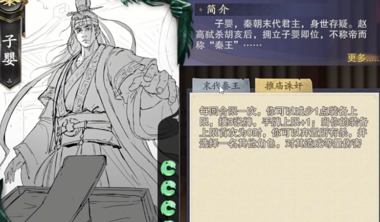 每当回合开始,子婴需要弃置手牌至手牌上限,这一过程虽然看似有些无奈,但他却可以将弃置的牌交给任意一名其他角色,这无疑是对队友的一种支援和对敌人的一次干扰,这种灵活的牌处理能力,让子婴在游戏中成为了一个难以预测的变数,而推庙诛奸技能,则更是将子婴的战术深度提升到了一个新的高度,每回合限一次,子婴可以减少1点装备上限,从而摸取3张牌,并且手牌上限也会随之增加1点。
