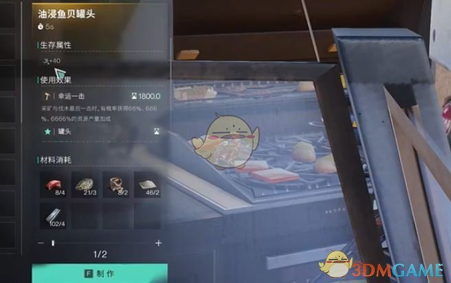 1、幸运一击:使用油浸鱼贝罐头后,在采矿和伐木的最后一击时,有概率获得资源暴击加成。