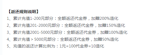 测试期间所有的充值在公测的时候都会以代金券的形式全部的返还。而且还会根据充值的金额去额外的加赠造化,具体的规则是累计充值一元到200元,全额可以返回代金券,额外还可以获得200%的造化。充值如果超过5000元的这一部分就可以全额的返回代金券,而且还可以获得50%的造化。