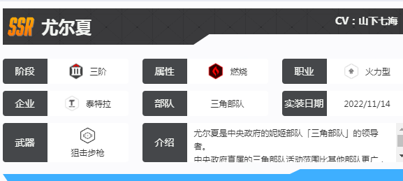 从战斗属性方面来看,这就是一个火力型的角色,属性是燃烧。狙击步枪换弹的时间是1.87秒,普通攻击就可以针对目标造成将近68.23%的伤害。如此就可以发挥出较好的优势,实力还是很不错的。