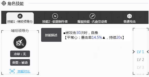 啃咬领导力这就是一个关键的被动技能,当攻击30次时就可以有效提升暴击率,大概就会持续20秒的时间。随着技能等级提升,暴击率加成也会逐渐的增加,最高就可以达到24.53%。因此在后期战斗的过程中就会大幅度的增强爆发能力,可以打出更高的伤害。