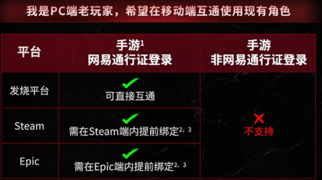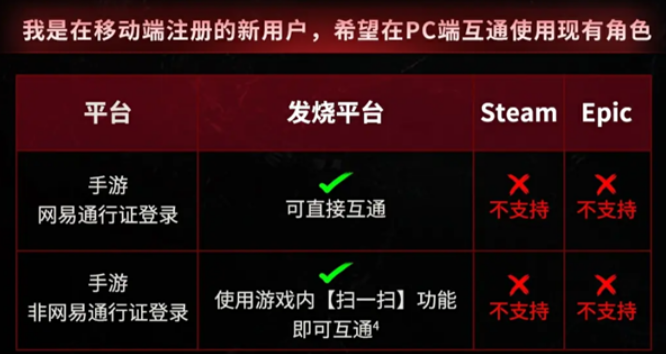 对于新玩家来说,情况稍有不同。使用网易通行证登录的移动端新用户,只有在“发烧”平台上才可以进行互通。在Steam和Epic平台这两个平台,网易通行证的玩家就没办法进行数据互通。而对于未使用网易通行证的玩家,在“发烧”平台上可以通过游戏内的“扫一扫”功能实现PC端与移动端之间的互通。需要注意的是,这一功能仅适用于“发烧”平台,其他平台暂不支持此功能。