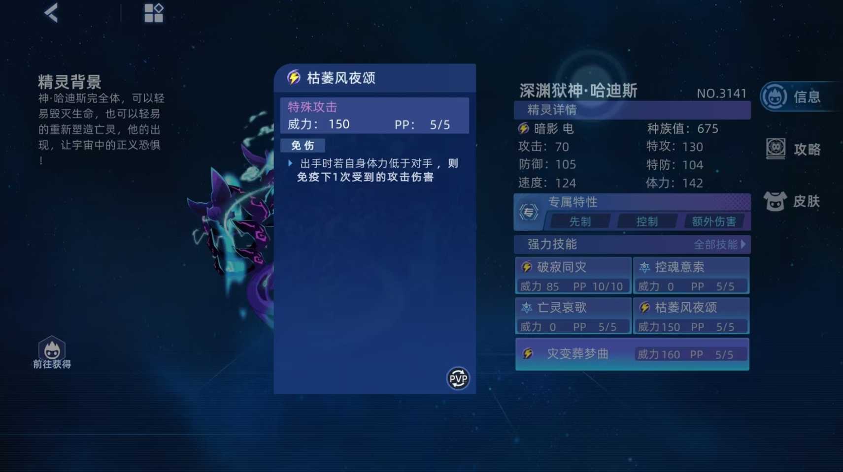 深渊狱神哈迪斯的神哈迪斯的完全体,它的专属特性非常强势,不仅在体力比对手低的时候能获得全技能先制加2的加成,而且在对抗非boss类精灵时还能令对手害怕,而且首回合还不用担心被对手秒掉,所以在大部分场合中,深渊狱神哈迪斯都有着极为强势的表现。