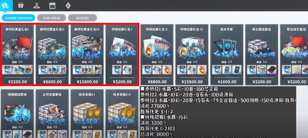 除了通行证之外,其他的礼包也有不同的特点。玩家可以根据个人的需求去选择限时礼包,就好像是新增的泰特拉礼包。特殊招募就只需要选择囤材卷即可。2号还有3号价格相对比较高,并不建议大家选择。另外如果想要选择月卡的话,那么大小月卡只需要2选1即可。