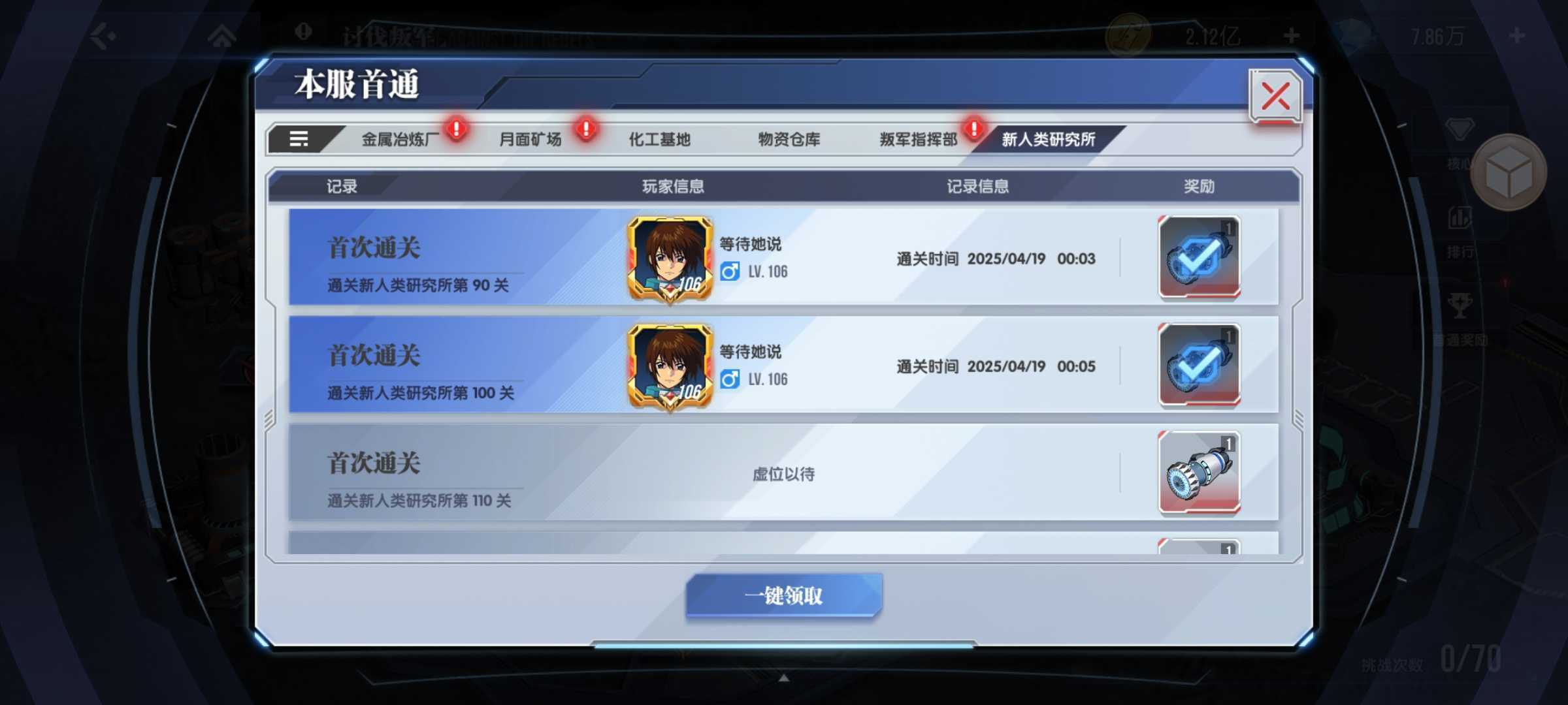 下面是我们区分系打的首通,其实开始并没有沟通这个事情,这就是默契,这样才能尽可能多的获取提升技能需要核心启动装置,尽早的提升各系关键技能。这个首通奖励是全服玩家共享的,所以,如果没有默契,最好提前最好沟通。这样才能做到最快速的拿到更多的核心启动装置,提升核心的技能等级。