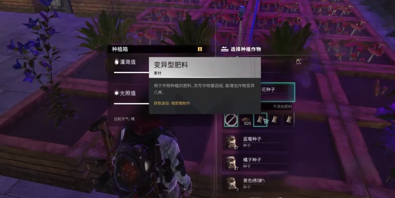 相比之下,基地种植更具系统性和可控性。在初期阶段,玩家应通过采集大量普通小麦种子,为后续种植提供基础材料。建设植物栽培床后,可将小麦种下,并使用具有变异效果的肥料进行培育。变异性肥料是关键道具,使用后可使作物产生变异,形成变异小麦。肥料可通过合成获得,也可通过完成相关模因研究解锁更高品质的复合型肥料。复合肥的变异成功率更高,适用于批量栽培需求。