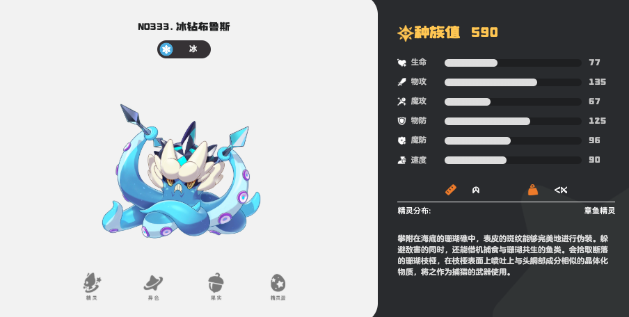 首先来看一看冰钻布鲁斯的基本情况,这个精灵隶属于冰系精灵,特性是挽留,在敌方拥有5层及以上的冻结层数后,则可导致敌方无法进行精灵替换。在种族值上高达590,尤其是物攻和物防两方面表现十分突出,物攻高达135,物防高达125,而魔法攻击表现差一些,所以在性格方面可以突出物攻、物防这两大优势,建议将性格设定为淘气。