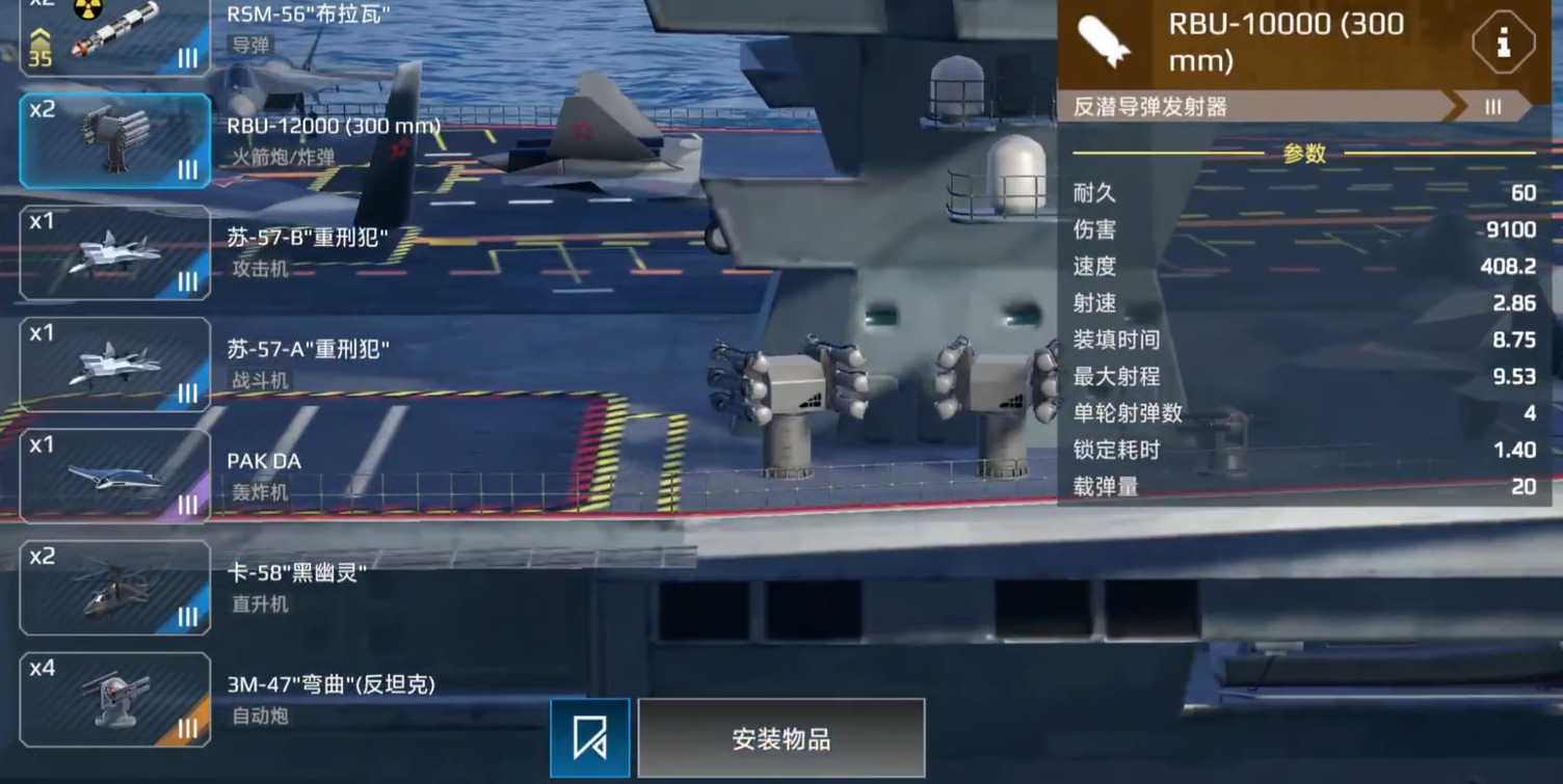在武器的配置上,玩家们如果想把它当作参与战斗的主力舰,那么就把自己所拥有的高性能飞机都装配到它这里就好。而在导弹的选择上,除了可以选择射程远的导弹来与飞机进行协同外,也可寻装填较快的来防一手紧急情况。火箭弹则更建议装配上能反潜的,避免自己被潜艇接近时缺少还手的手段。