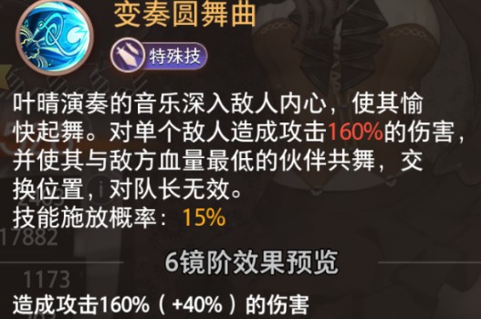 叶晴演奏的音乐深入敌人内心,使其愉快起舞。对单个敌人造成攻击160%的伤害,并使其与敌方血量最低的伙伴共舞,交换位置,对队长无效。