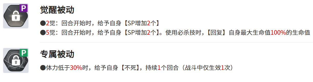 觉醒被动技能分为2觉和5绝,2觉能够给自己身上附加上2个sp,5觉在附加2个sp的基础上,兰吉尔斯使用必杀技后,还能恢复自身最大生命值100%的生命值,专属被动技能则是在兰吉尔斯的血量低于30%的时候,给自己赋予上不死的状态。