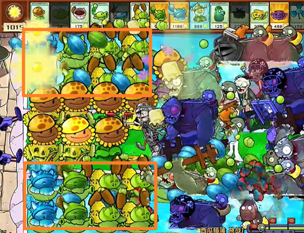 2、中期会出现很多巨人僵尸,打不过来我们就使用吹风来反制,期间不断种植上下4路的西瓜猫蒲。