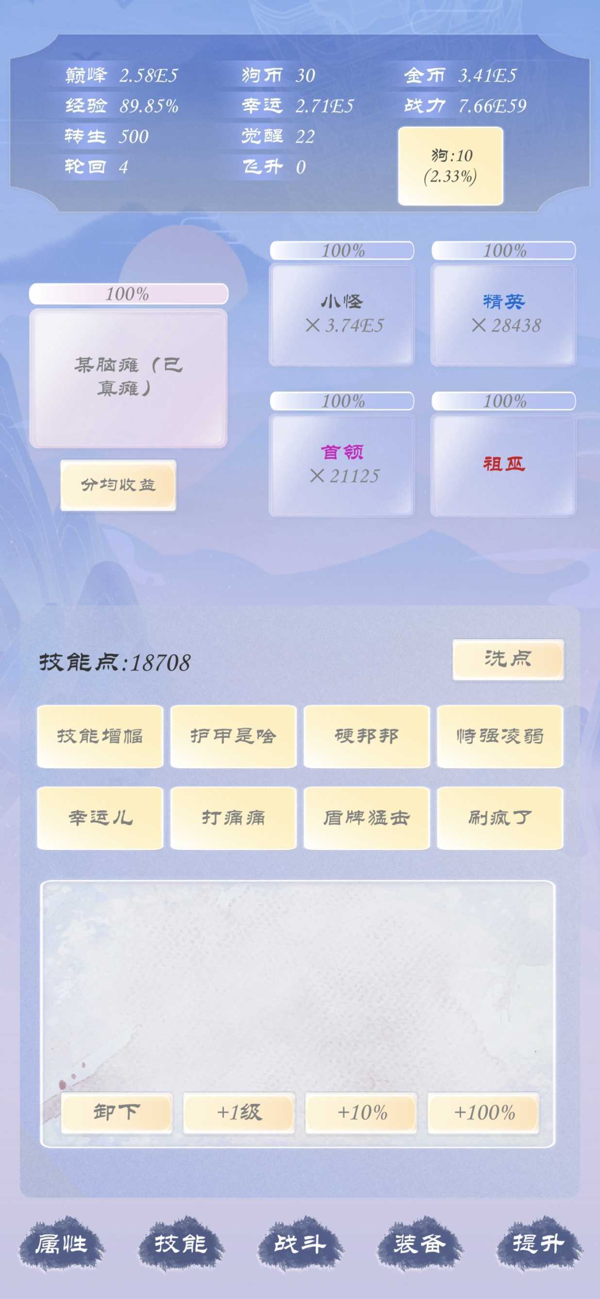 下一个阶段开始点幸运,憋属性,点一级神器伏羲琴 准备转生,幸运增加怪物数量,可以平衡幸运与难度获得最高的经验,等级一百之后准备下一步