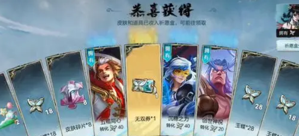 2、在本次精彩的活动中进行祈愿时,您有可能会幸运地获得重复的皮肤。而这些重复的皮肤并不会成为无用之物,它们会自动转化为珍贵的玉蝶,为您的游戏进程带来更多的助力和惊喜。