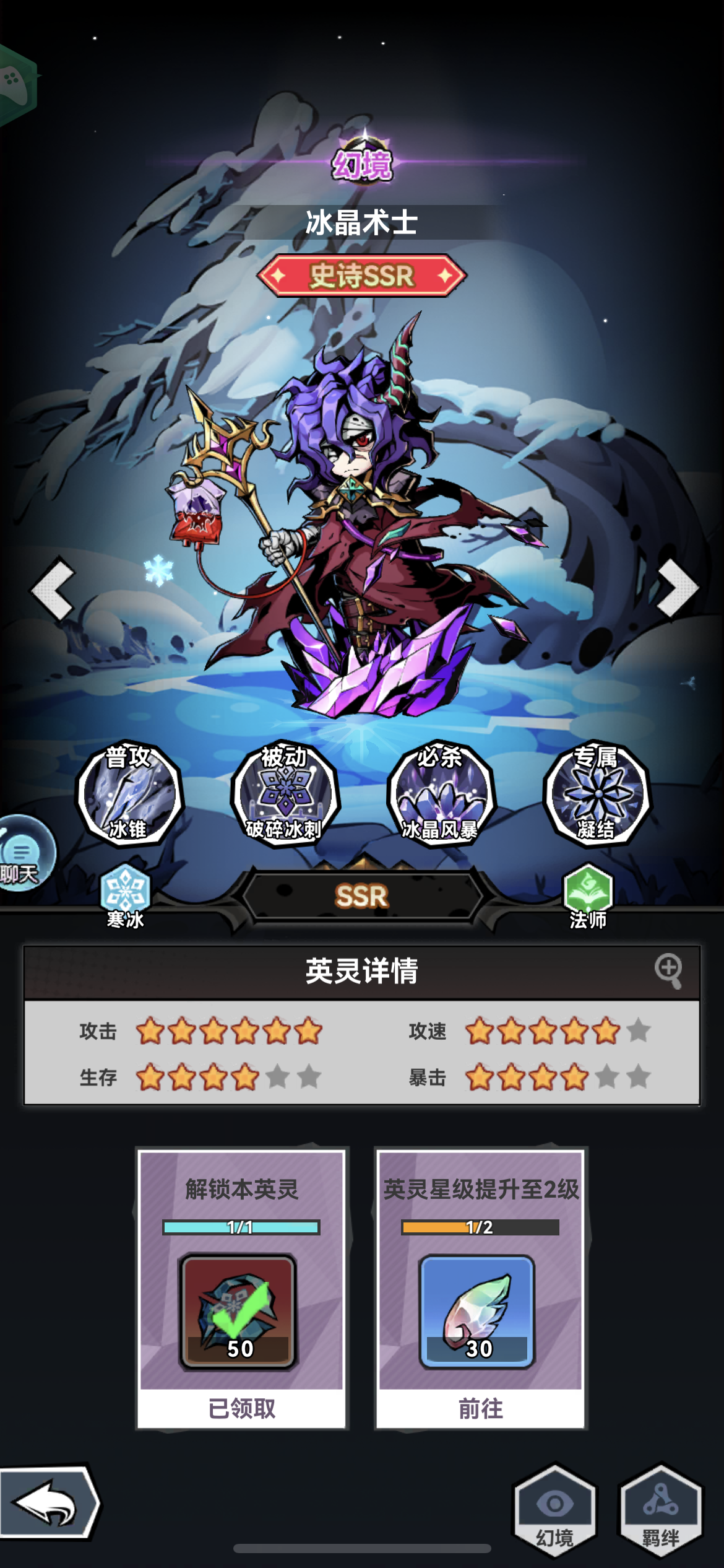 啊~原来是高贵的控制系啊~哈哈哈哈玩个梗。但是冰晶术士确实是一个比较优秀的群体控制法师。获取难度也是等同于黑胡子的史诗级ssr。小怪走太快怎么办!boss打不动怎么办!就试试我们家冰晶术士的控制吧!在塔防模式中,因为每一位英灵都有固定的攻击距离,当小怪在攻击距离中打不死时,多希望它可以走得慢点啊!哎~冰晶术士的群体控制可以做到!在控制的同时也提供了不俗的伤害,高贵的法爷啊。