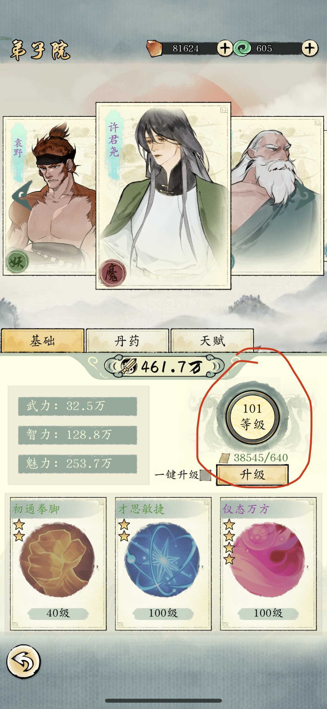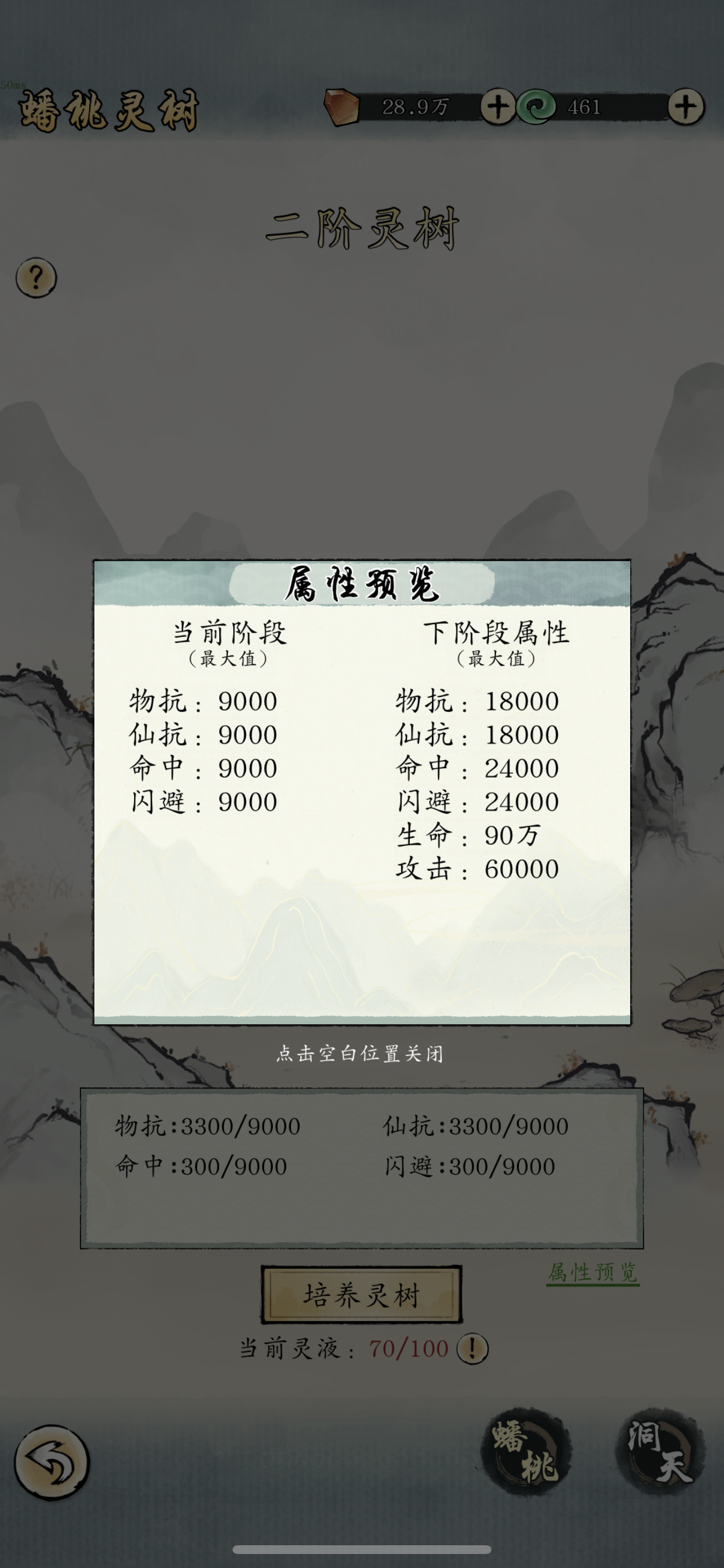 弟子的魅力和智力决定灵树养成速度也是战斗力提升的主要通道,魅力和智力可以让你快速通关第一洞天增加灵液上限和生产。