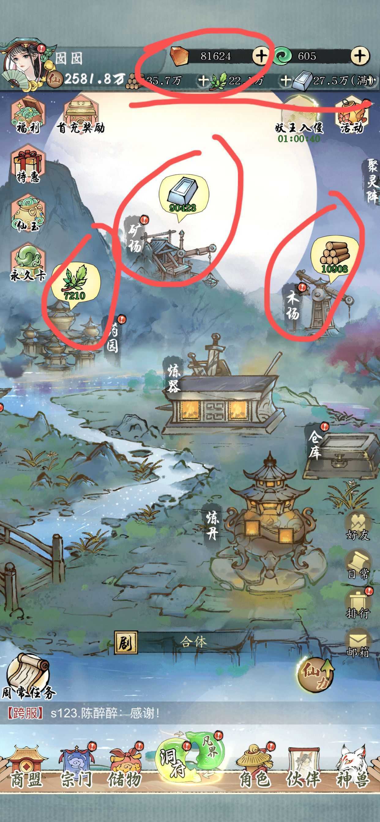 1.飞升仙界之前先存好灵草、木头、玄铁还有灵石,尽量多点 。
