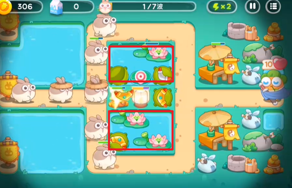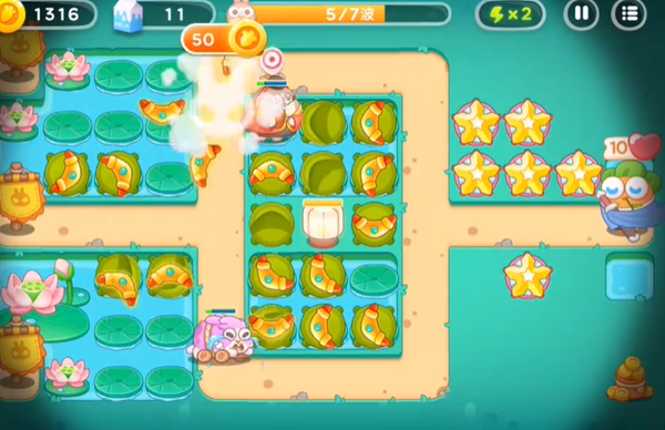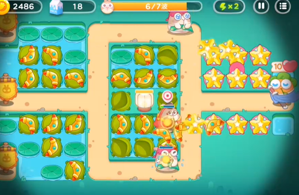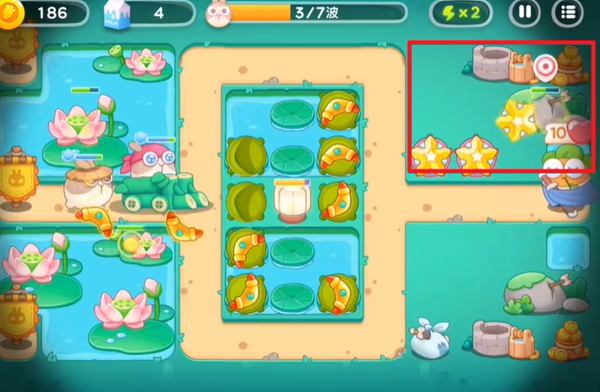 3、将中间水池上的格子都放置好回旋镖之后,开始在右边建造星星炮塔,利用星星炮塔拆除道具,为后续的布局创造更好的条件。