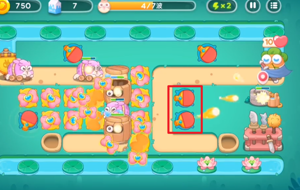 1、游戏开局的时候,在右侧的位置建造一个满级的球拍,这个满级球拍的主要用途是清理其附近的道具,然后在左下角的位置放置一个蝴蝶结。