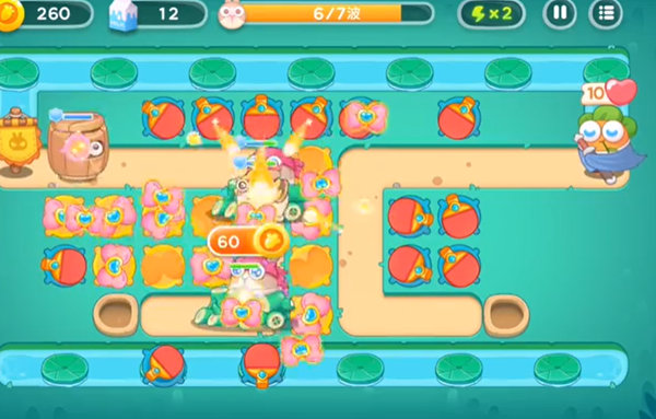 2、完成开局在右侧的建造后,接着在中间和左侧各建造一个满级的蝴蝶结,然后利用这两个满级蝴蝶结继续清理右侧的钱袋。钱袋被清理后可以获得一定的资源,有助于游戏的发展。