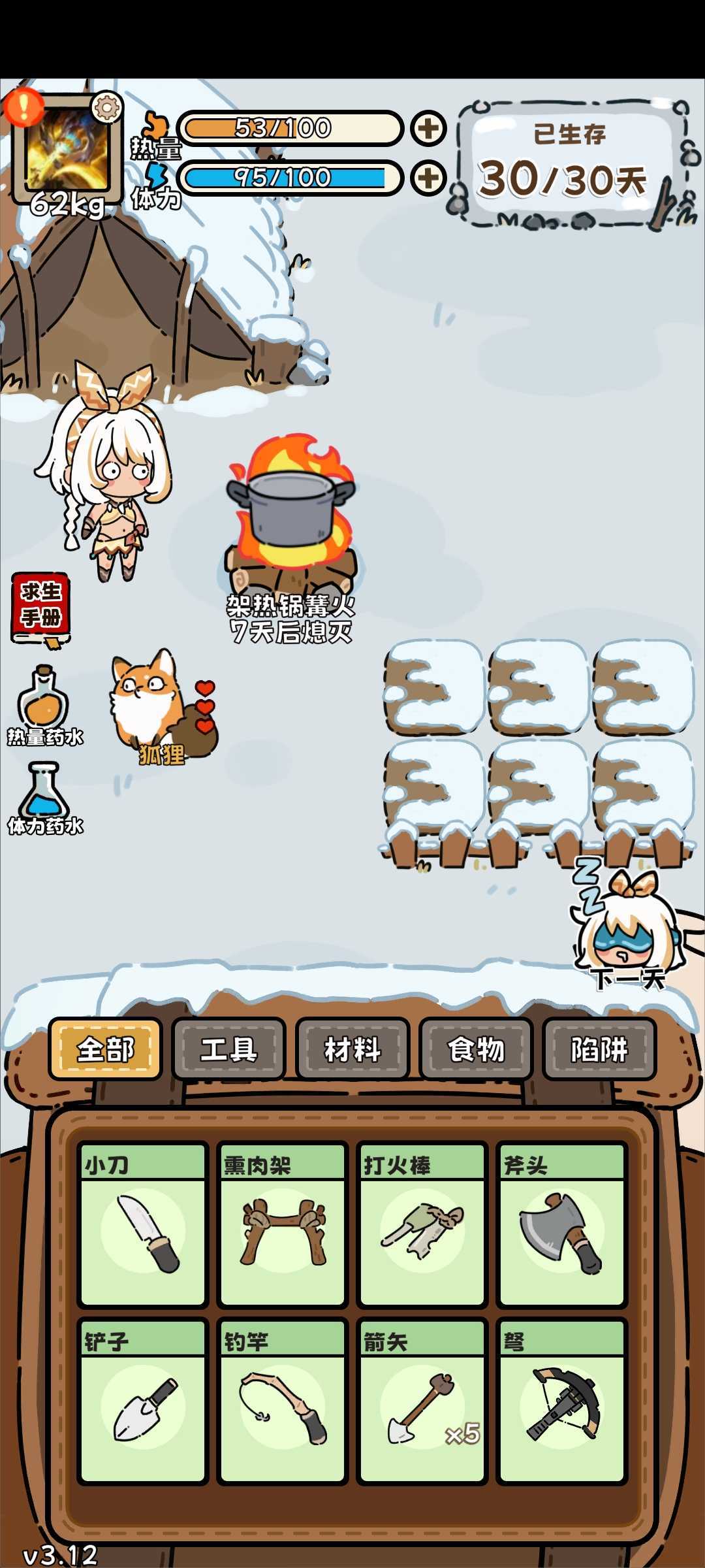 第三个空投拿药水,留三天的冰块一起开,最后一瓶药水合蘑菇,1腐烂5木头,留够烧冰的也可以梭哈蘑菇,正常运气两瓶药水开三天冰应该有150到200的热量,剩下就是看你运气这一局出啥了,要是开出熊和豹基本过了。