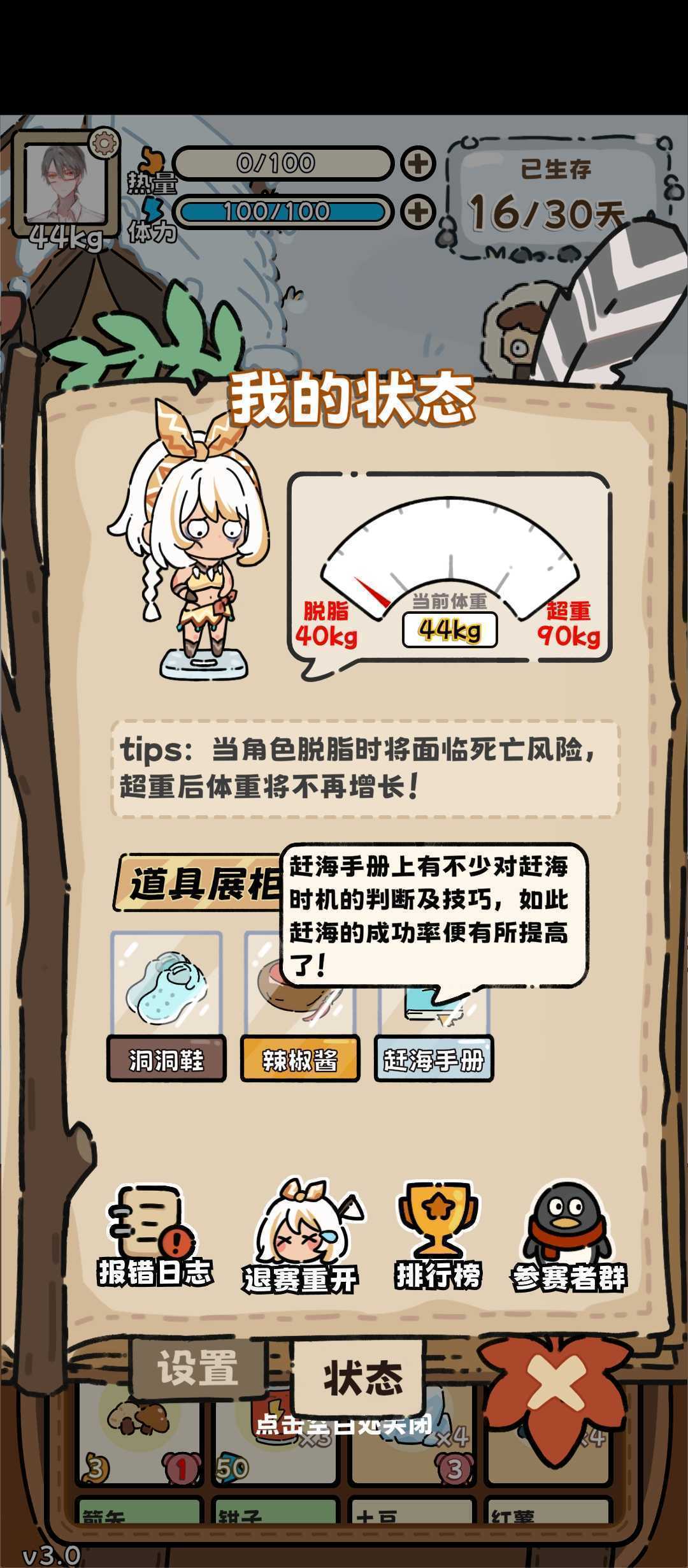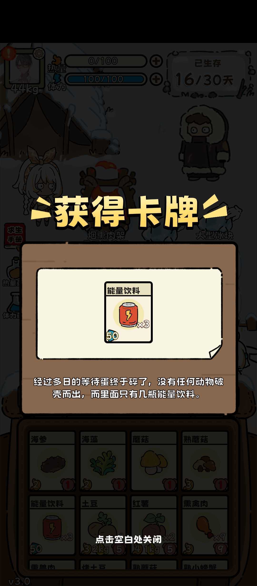 《荒野求生模拟器》v3.5荒野狂赌模拟器攻略!通用空投:羽绒服(热量消耗降低,约平时20冬天30➕)、幸运药水(提升成功率和命中)、能量饮料(2×50体,前期)。