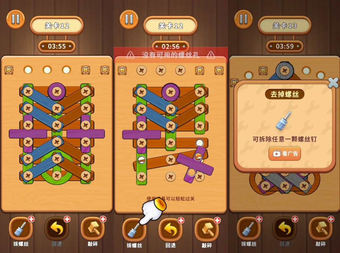 在游戏界面下方,设有若干功能按钮:拔螺丝、回退和敲碎