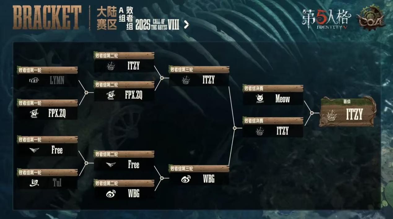ITZY vs FPX.ZQ第二局下半场, ITZY_BaiLu时空之影劣势局开门战四抓翻盘:ITZY_BaiLu时空之影追击“囚徒”被牵制三台密码机,“囚徒”被大副救下后二次牵制超出化险为夷时间,二次上椅后密码机进度只差半台。ITZY_BaiLu果断放弃守椅,消耗大副使用最后的道具后直接传送飞行家将其命中逼走。后时空之影本体压住遗产机,伊斯人尾随“囚徒”,找准时机利用二阶技能传送落地将其击倒,而囚徒没有回光返照被淘汰。面对三人开门战,ITZY_BaiLu骗出飞行家道具后传送飞行家进行追击以拖出闪现时间,逼出道具后再传回大门追击大副,闪现将其击倒挂上椅。在挽留最后三十秒,ITZY_BaiLu传送小门击倒急于开门的飞行家,再传送回防,挽留最后一秒抽刀击倒古董商,拿下四抓终结比赛。