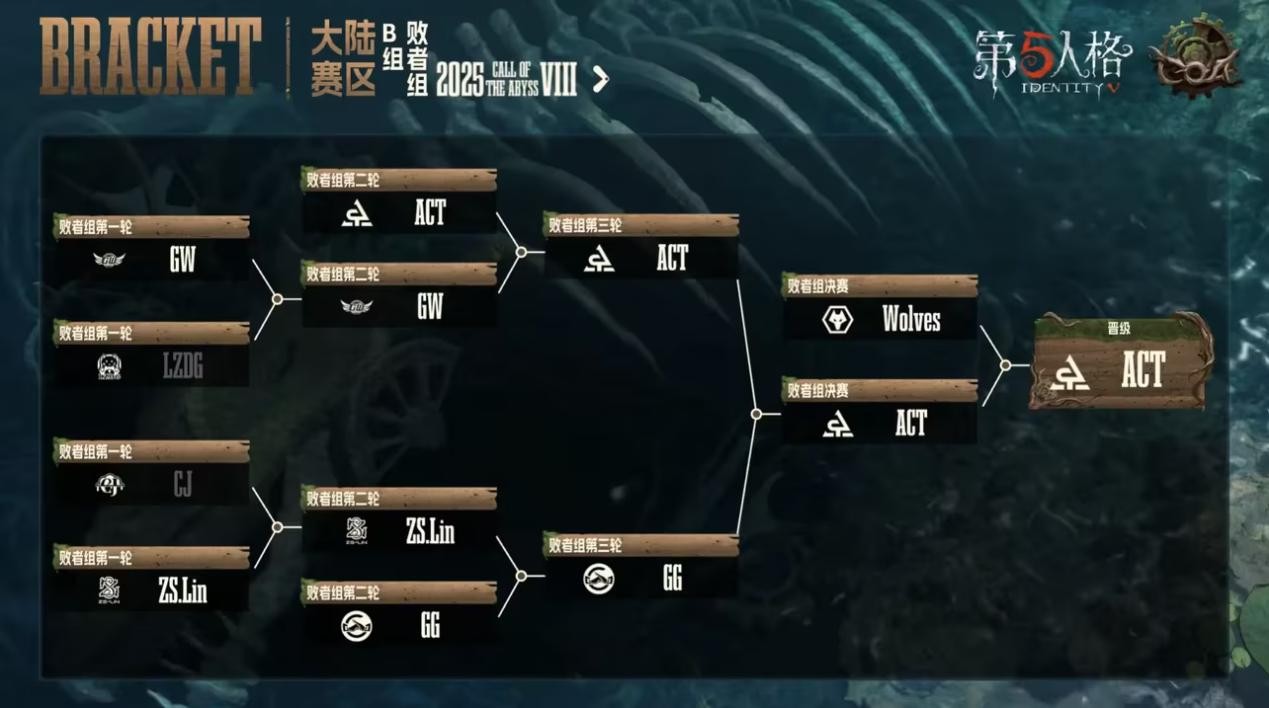 成都Wolves vs ACT第三局下半局,ACT_zz9梦之女巫四抓逆转比分顺利晋级:开局梦之女巫追击机械师,击倒机械师时密码机进度两台但机械师娃娃没有被干扰,求生者方节奏较好。在守椅战中,ACT_zz9在外围躲避火箭筒拦住救人的哭泣小丑,机械师被极限救下。ACT_zz9操纵寄生信徒处理掉娃娃并压住中场遗产机。面对二救古董商的陪跑ob,ACT_zz9果断底牌切闪现击倒淘汰机械师,并熟练应对ob,双信徒压迫追倒古董商,无缝续节奏逆转局势。古董商被挂在中场,而求生者没有选择新开密码机,中场80%的密码机被机人同守。一番拉扯后求生者全员残状态,古董商和“心理学家”同时被追击,最终古董商被寄生信徒闪现击倒,哭泣小丑新机也被信徒守住,三名求生者位置都被掌握,疲于奔命逐个被击倒,最终ACT_zz9拿下四抓。