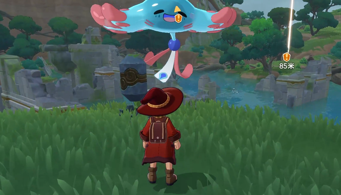 大家可以绕到谜语者的身后,它身后区域的草坪上,会有很多只绿叶松鼠,我们随便捕捉一只,再和谜语者对话递交即可,另外递交完后不要忘记激活旁边的石柱,接着来到西边的智者处。