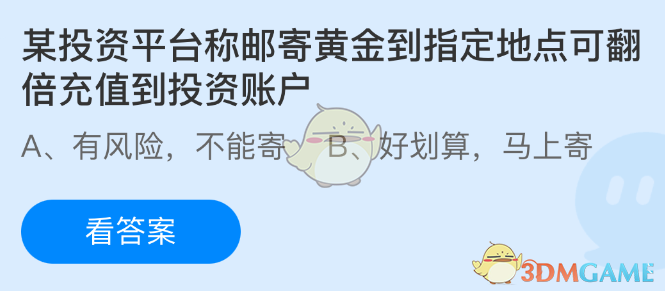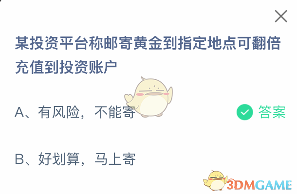 某投资平台称邮寄黄金到指定地点可翻倍充值到投资账户?这是支付宝蚂蚁庄园小鸡答题5月15日题目,选择正确答案,答对可获得 180g 饲料,答错则获得 30g 饲料。为了保证正确率,本次给大家带来了今日正
