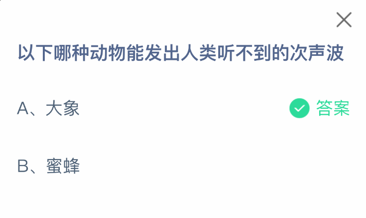 以下哪种动物能发出人类听不到的次声波?这是支付宝蚂蚁庄园小鸡答题5月16日题目,支付宝小鸡答题是大家非常喜欢的活动,大家获取饲料就可以喂养小鸡领取更多的蛋去帮助更多的人了!今日正确答案是【大象】,大象
