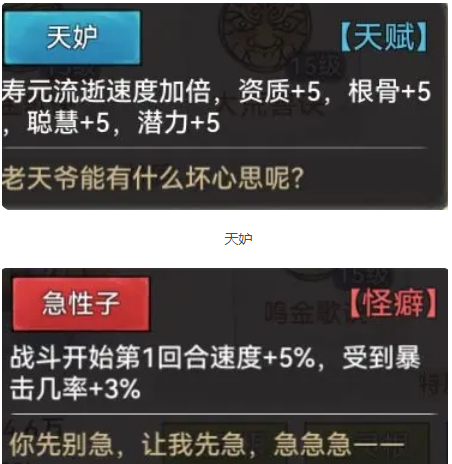 我们使用【画师】,是因为其天生速度快,可以帮助我们在pvp对战时抢到先手,所以,对于【画师】,祖师们挑选时需要首先注意的就是可以加速度【词条】,比如【急公好义】、【杠精】、【急性子】、【胆小】等,除此自外,比较特殊的速度【词条】有两个:【提笔有神】和【天妒】,【提笔有神】要求主武器佩戴【笔】才会给5%的速度,而我们主武器佩戴【扇】所给的速度加成远超于此,所以【提笔有神】一般不做考虑;由于【天妒】会给弟子加5点潜力,而潜力会影响弟子属性包括速度,故而我们可以把【天妒】当作半个速度【词条】。