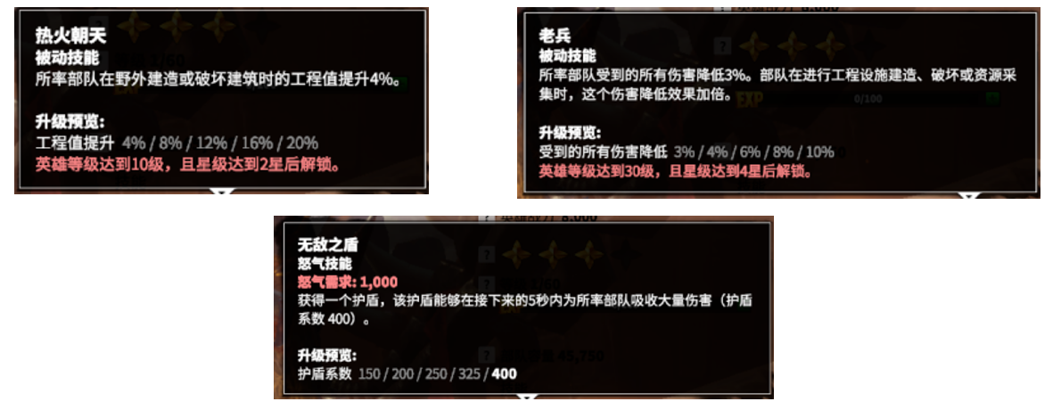 建造部队的英雄则选择欧德,欧德作为工程系英雄,二技能热火朝天可以大幅提升建造时的工程值,四技能老兵配合一技能无敌之盾可以在建造时提高部队的生存能力,避免在被袭击时损失过大。