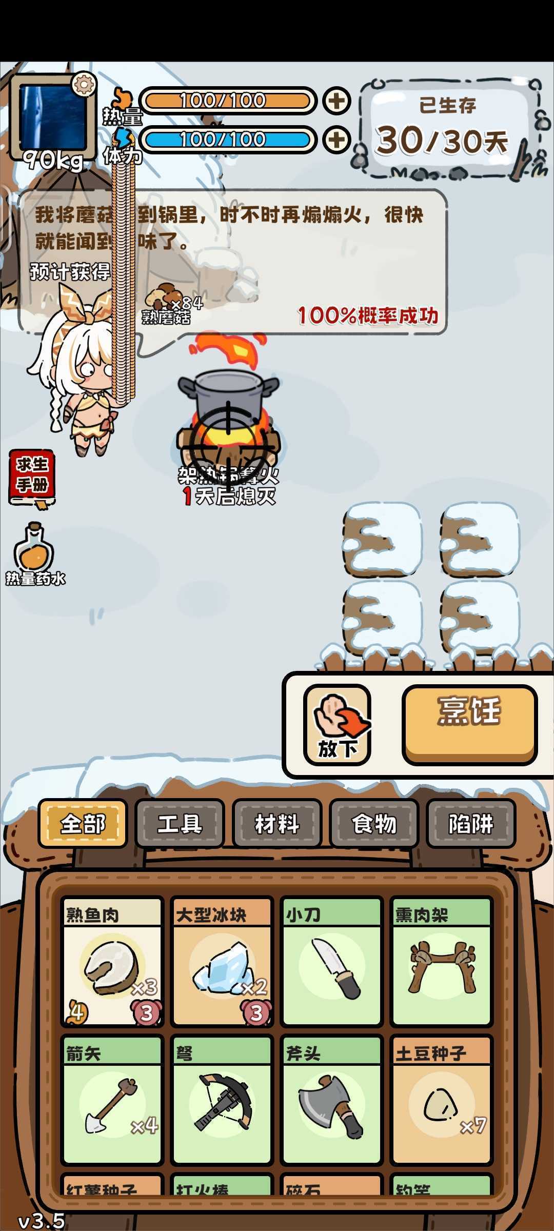 越冬才是这个游戏真正的难点和考验,入冬之后要小心控制自己的热量和体重,优先把临期食物吃掉,并且根据食物储备合理安排得到的食物到底是煮还是熏,偶尔爱斯基摩人会来找你要工具,有就给他就行,反正放在自己手里也没用了,木材足够的话就可以融化冰块,但注意融化冰块会掉一天的燃烧时间,别把篝火弄灭了。如果有幸运药水的话,记得攒三天的冰一起喝了幸运药水再开。等到热量空了的时候还可以看一次广告恢复满热量,这个也够撑两天的,如果20天之后运气好能出个熊或者海豹,那这把基本就稳了,但更多的时候运气没有那么好,关键的操作就来了,这个操作决定了你能不能通关,这个关键就是种蘑菇,前面不是让你有体力就去砍木头吗,这个时候就要用上了。由于种蘑菇非常重要,接下来单独讲。